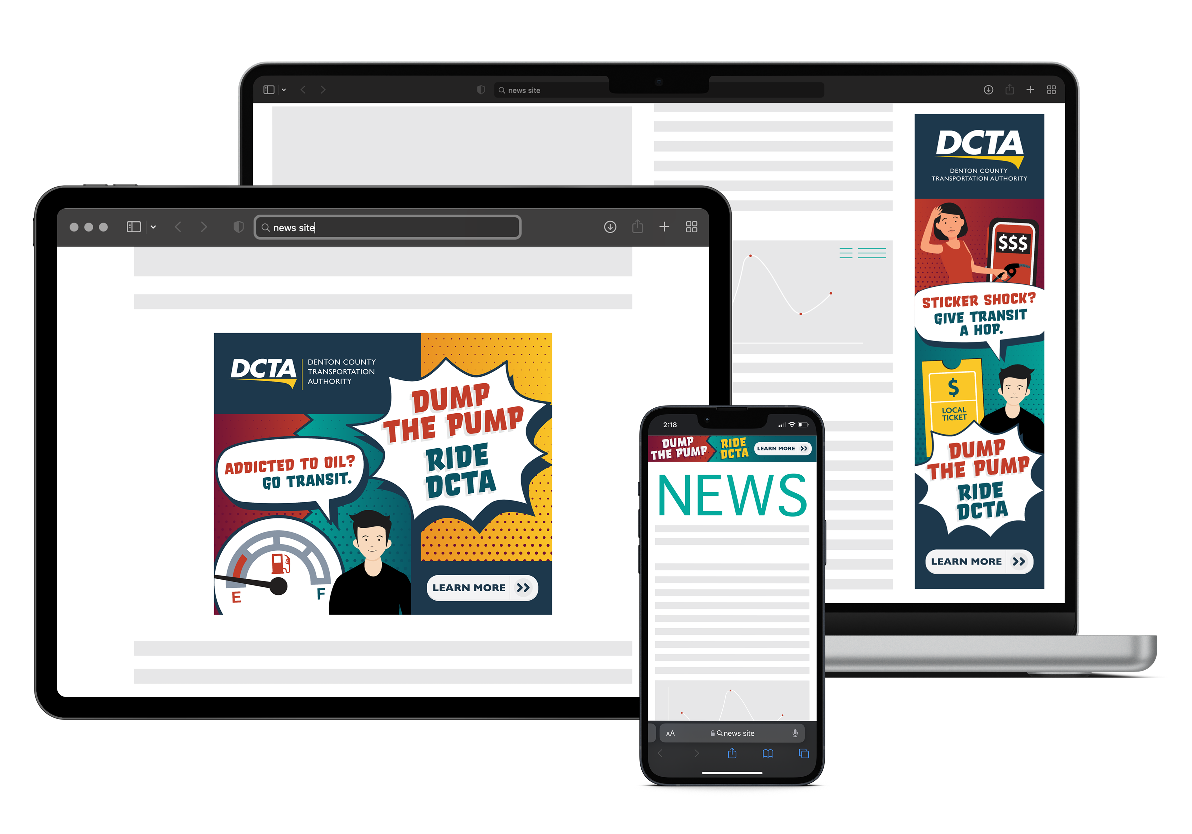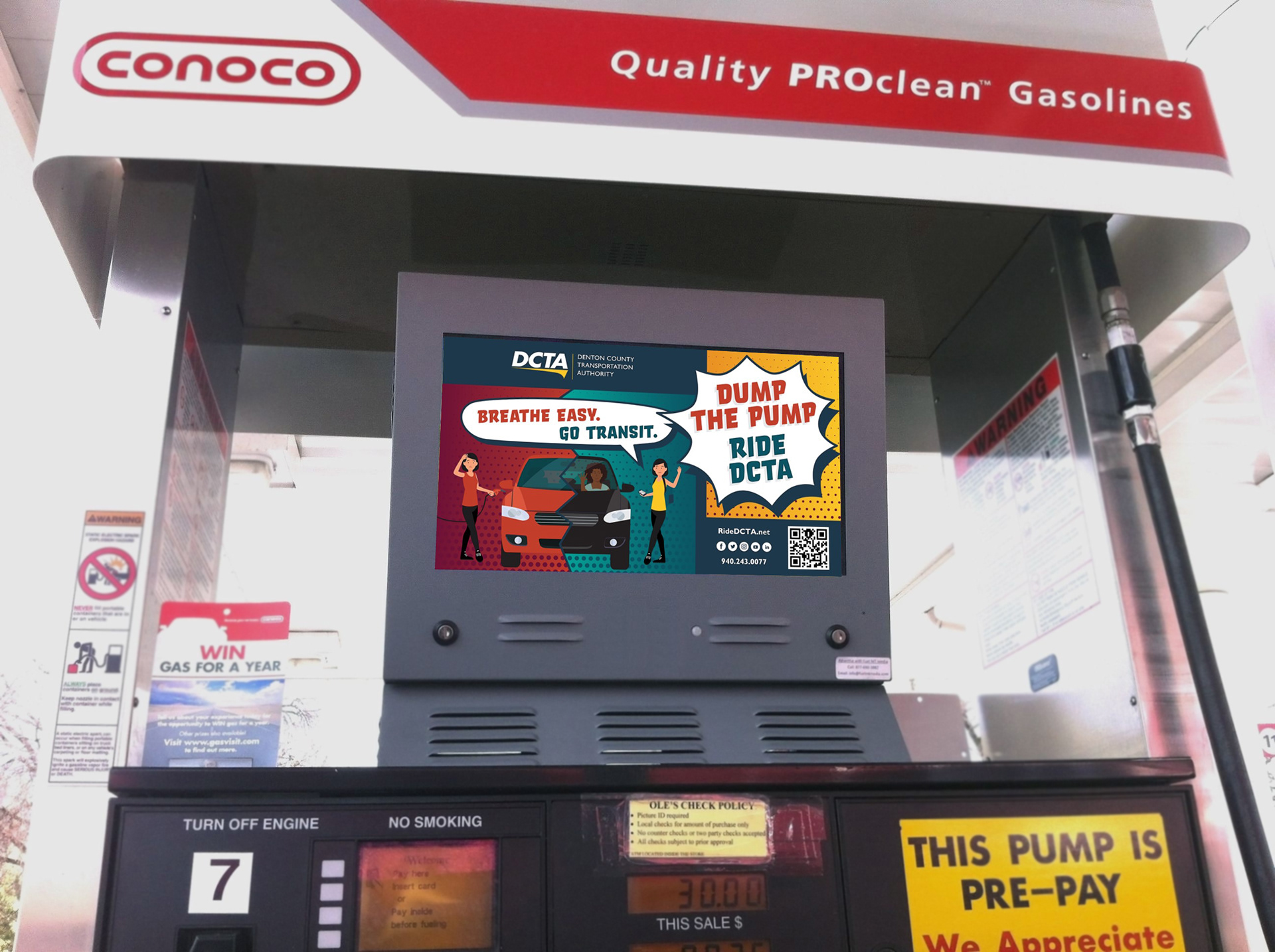 When gas prices soared, DCTA saw an opportunity to promote their cost-saving services. Within a week, I had designed the campaign assets, which spanned digital and print advertising, including monitor ads at gas pumps.